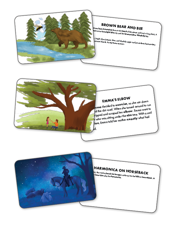 Sound Story Cards are brief, winsome, illustrated stories using several keywords that represent each phonics skill taught. Included are 30 cards—26 letters of the alphabet and four consonant digraphs (ch, sh, th, and wh).